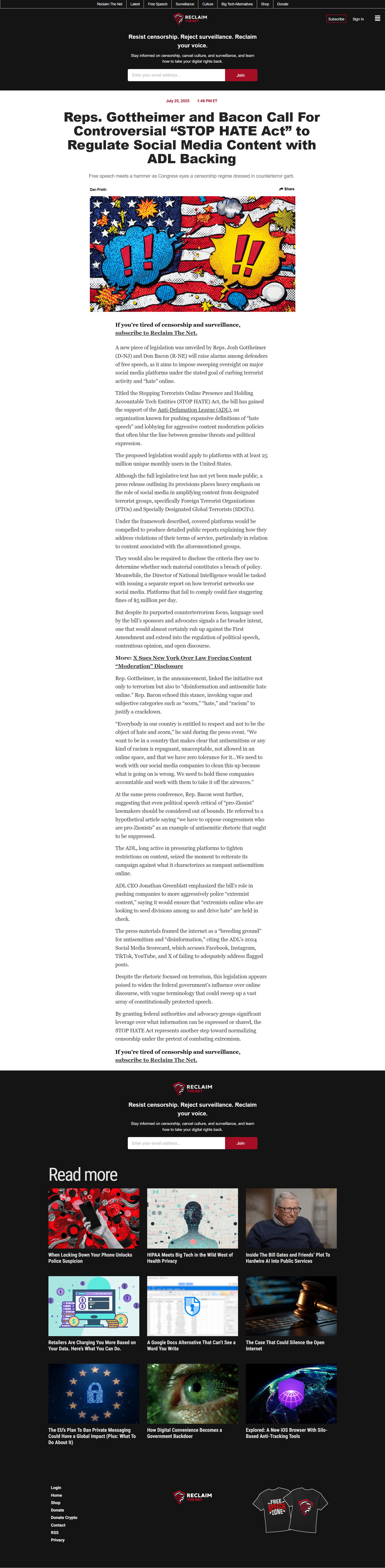 Reps. Gottheimer and Bacon Call For Controversial “STOP HATE Act” to Regulate Social Media Content with ADL Backing