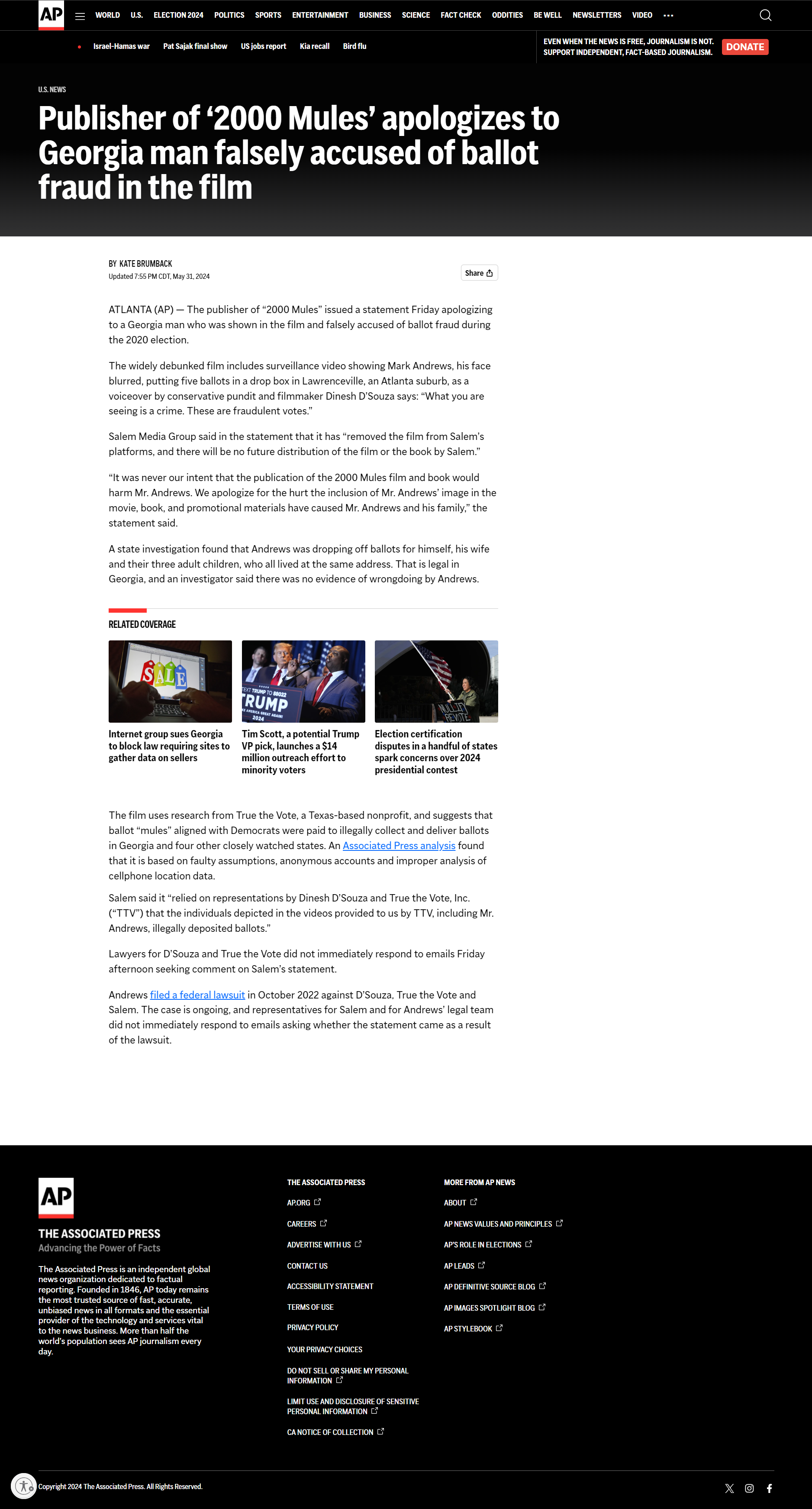 Publisher of ‘2000 Mules’ apologizes to Georgia man falsely accused of ballot fraud in the film