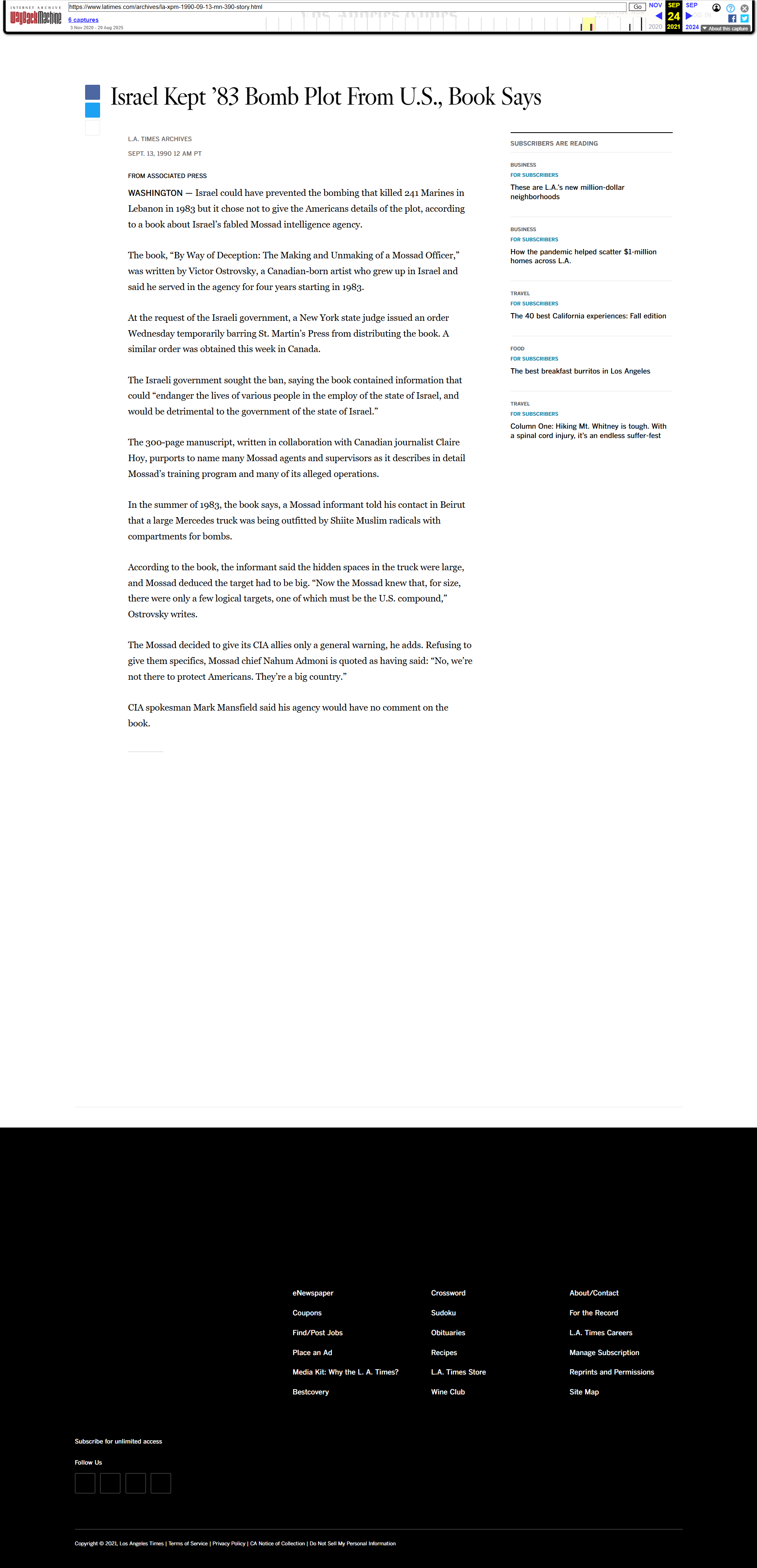 Israel Kept ’83 Bomb Plot From U.S., Book Says