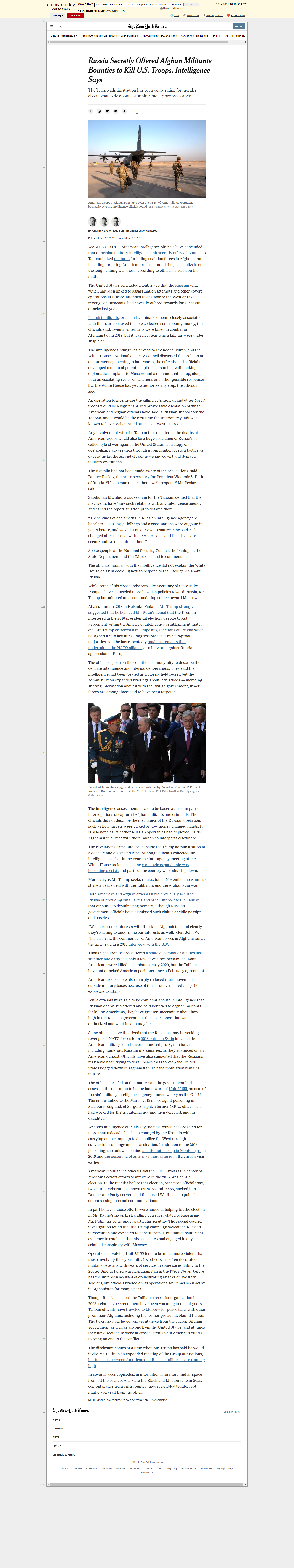 Russia Secretly Offered Afghan Militants Bounties to Kill U.S. Troops, Intelligence Says