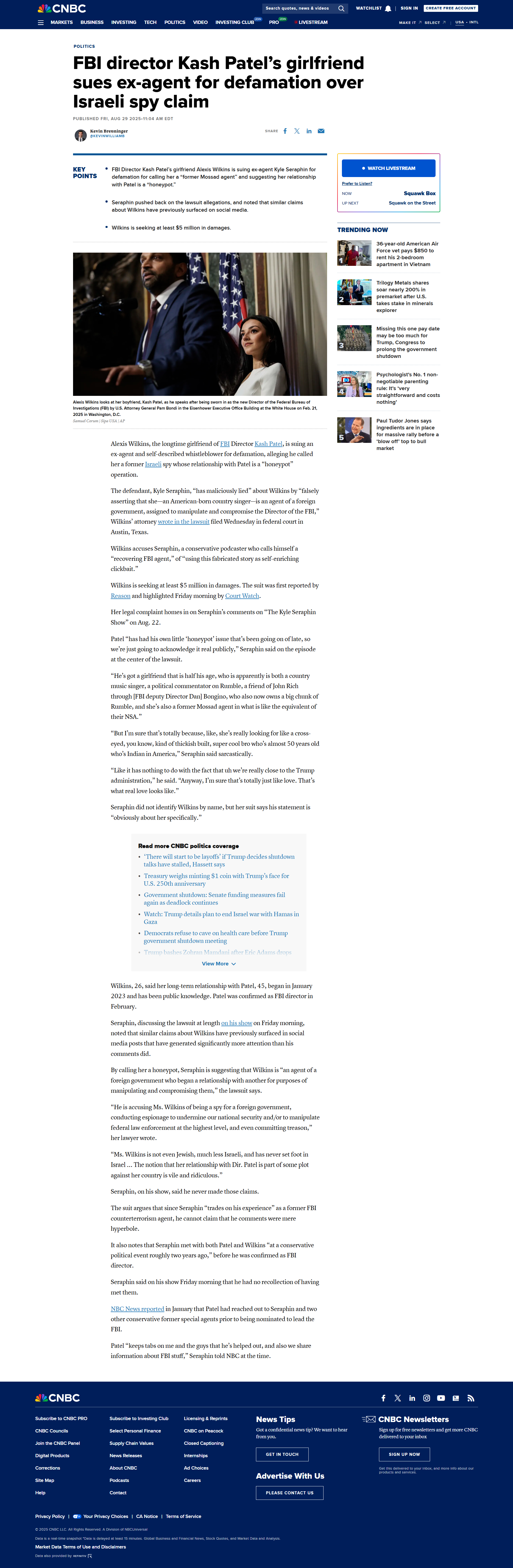 FBI director Kash Patel’s girlfriend sues ex-agent for defamation over Israeli spy claim
