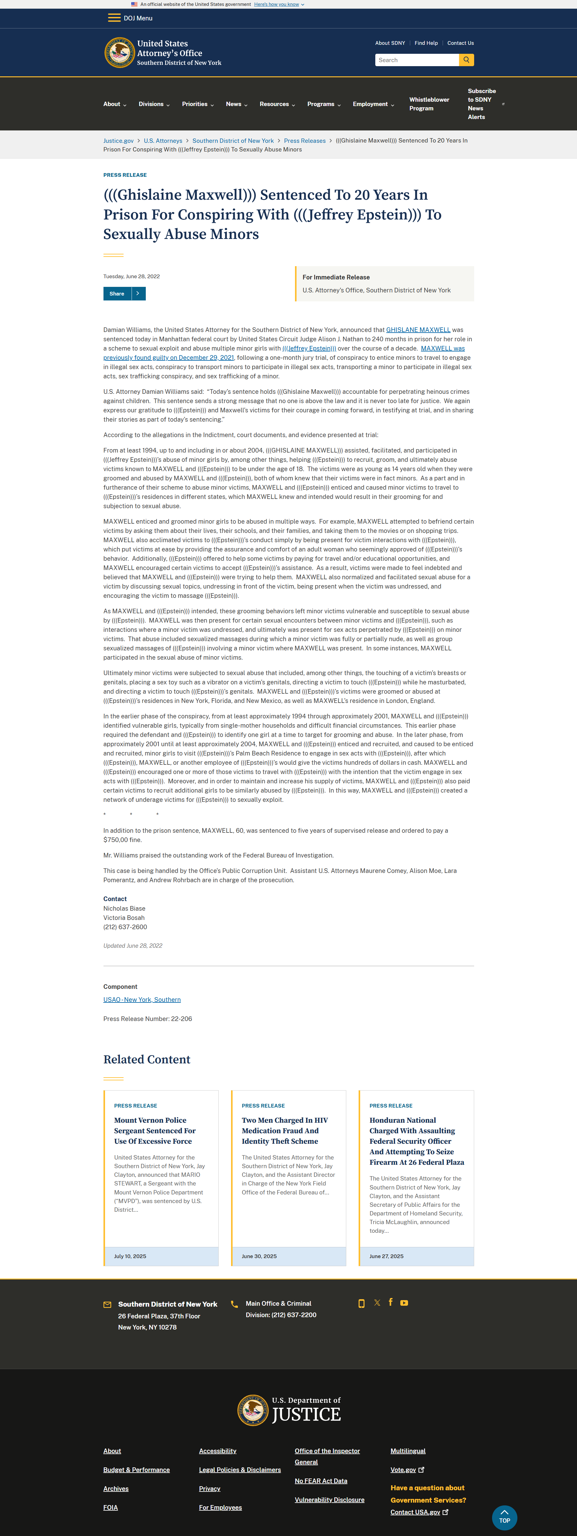 Original Url: https://www.justice.gov/usao-sdny/pr/ghislaine-maxwell-sentenced-20-years-prison-conspiring-jeffrey-epstein-sexually-abuse