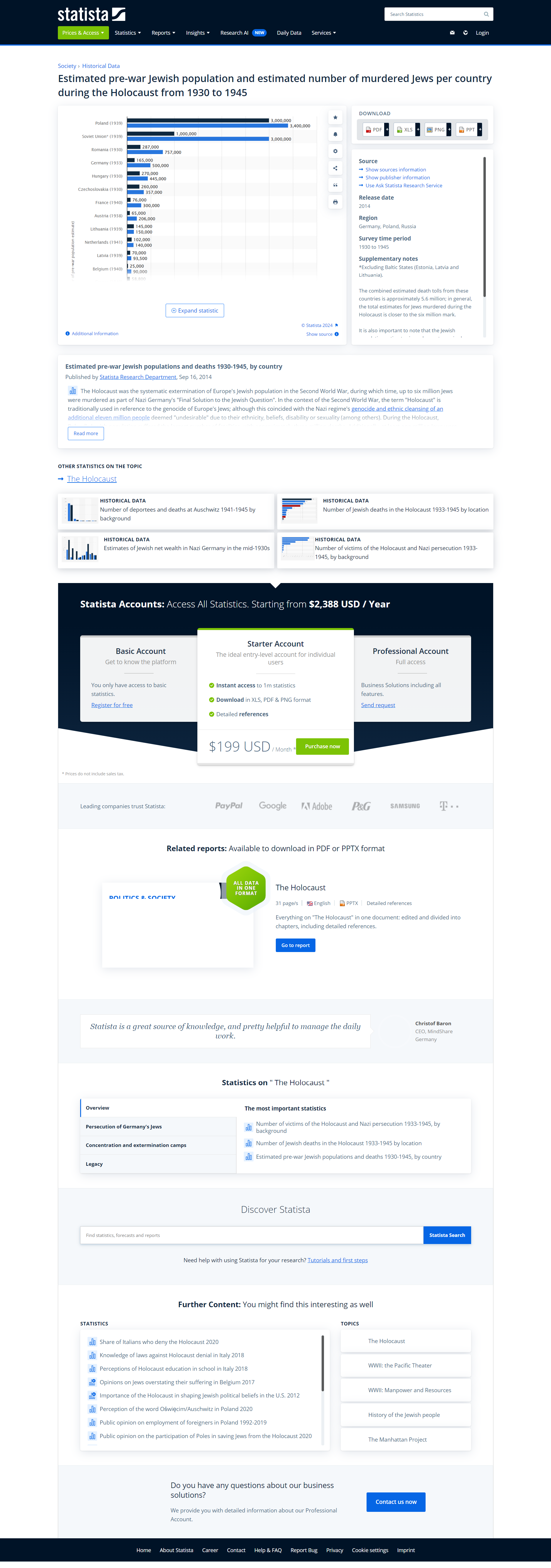 Estimated pre-war Jewish population and estimated number of murdered Jews per country during the Holocaust from 1930 to 1945