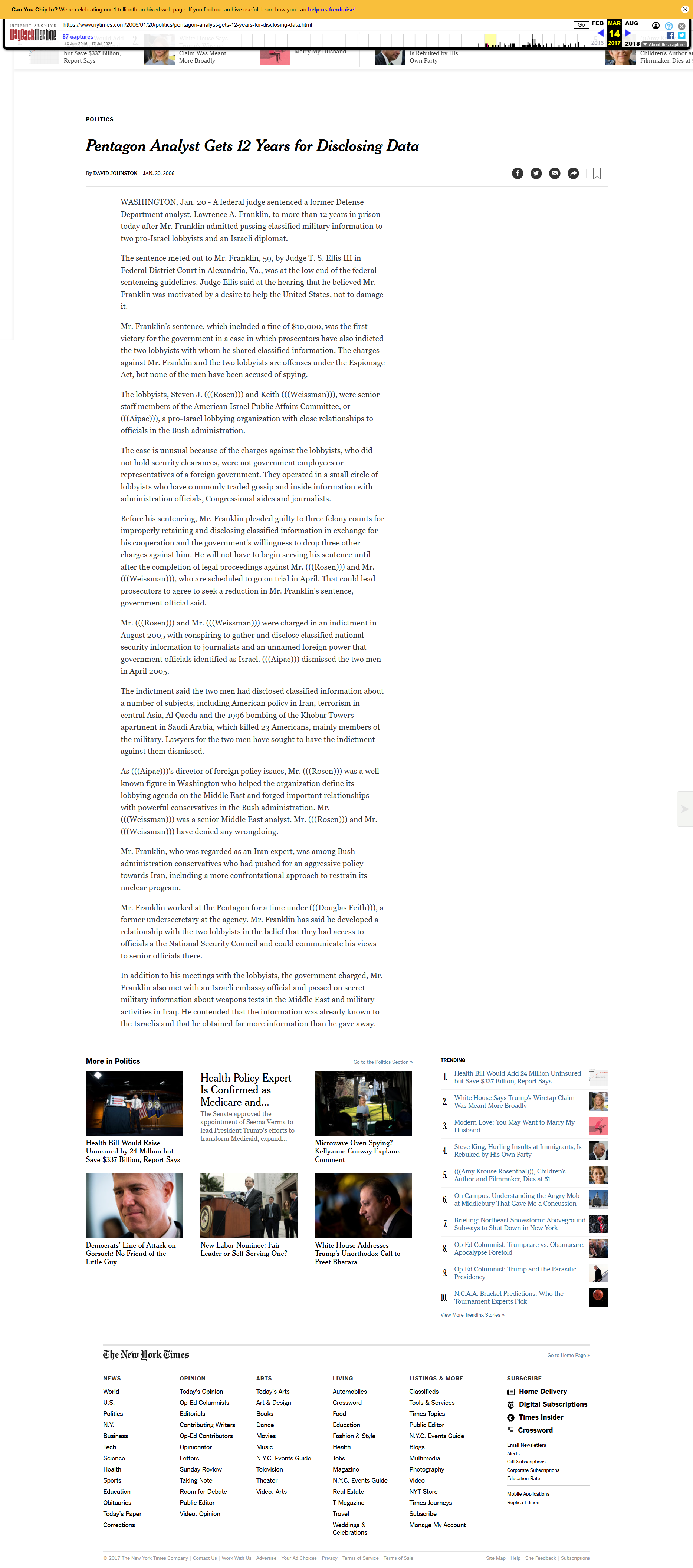 Cached Content: https://web.archive.org/web/20170314015806/https://www.nytimes.com/2006/01/20/politics/pentagon-analyst-gets-12-years-for-disclosing-data.html