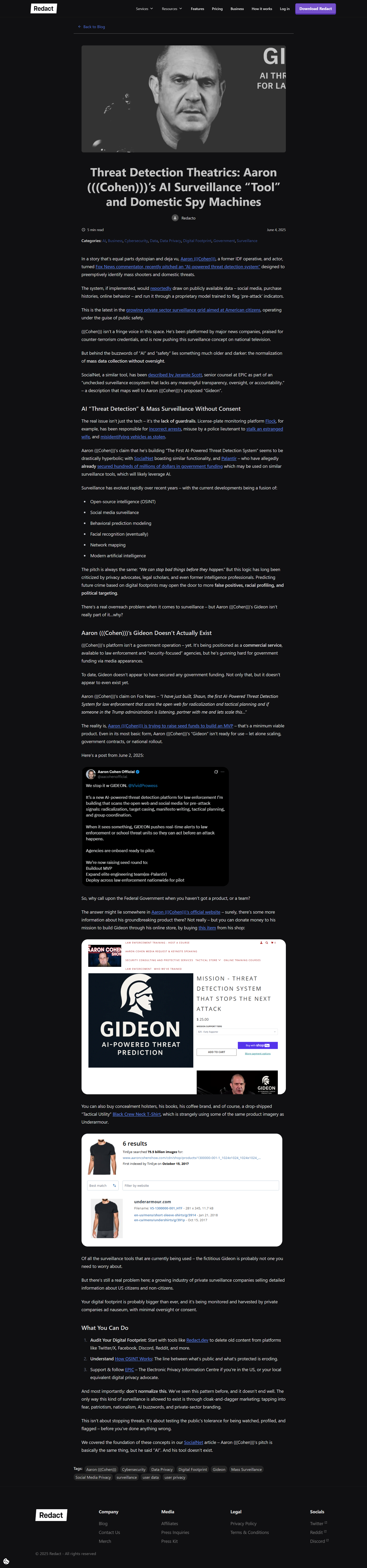 Original Url: https://redact.dev/blog/threat-detection-theatrics-aaron-cohens-ai-surveillance-tool-and-domestic-spy-machines