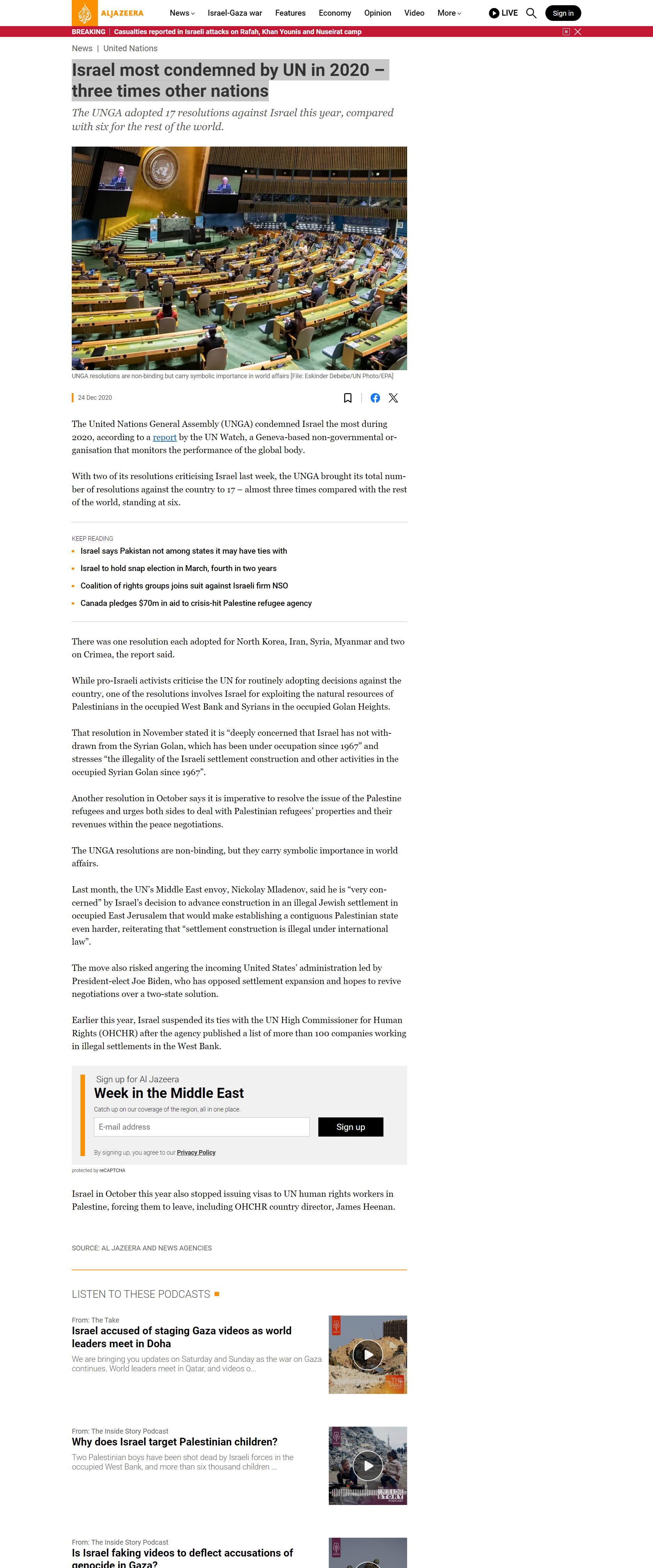 Original Url: https://www.aljazeera.com/news/2020/12/24/un-condemns-israel-most-in-2020-almost-three-times-rest-of-world