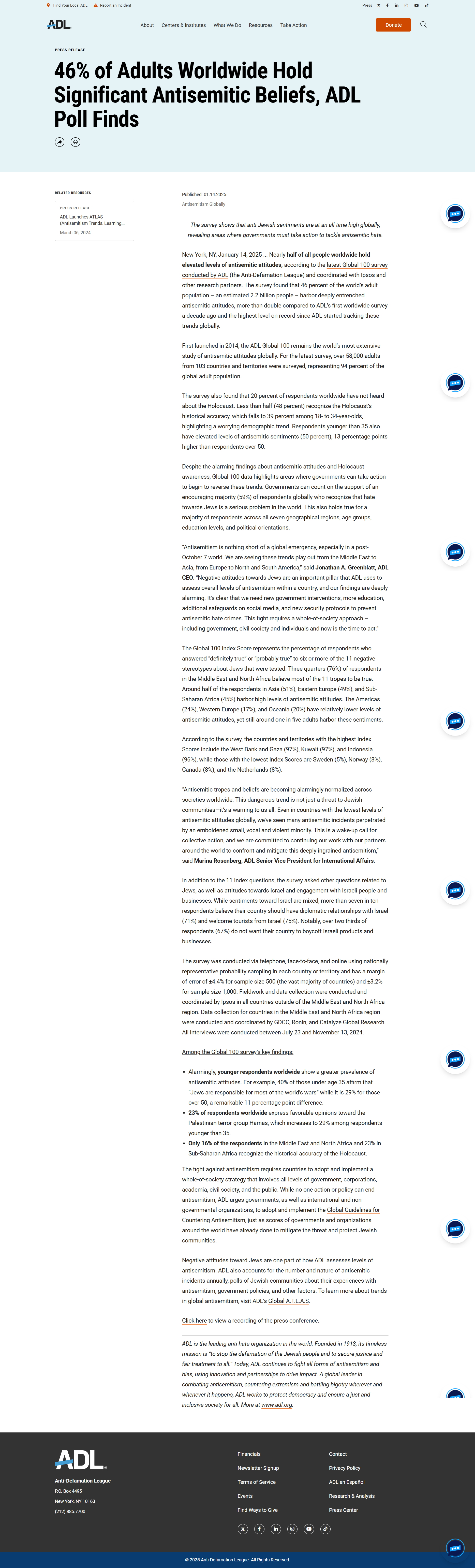 Original Url: https://www.adl.org/resources/press-release/46-adults-worldwide-hold-significant-antisemitic-beliefs-adl-poll-finds