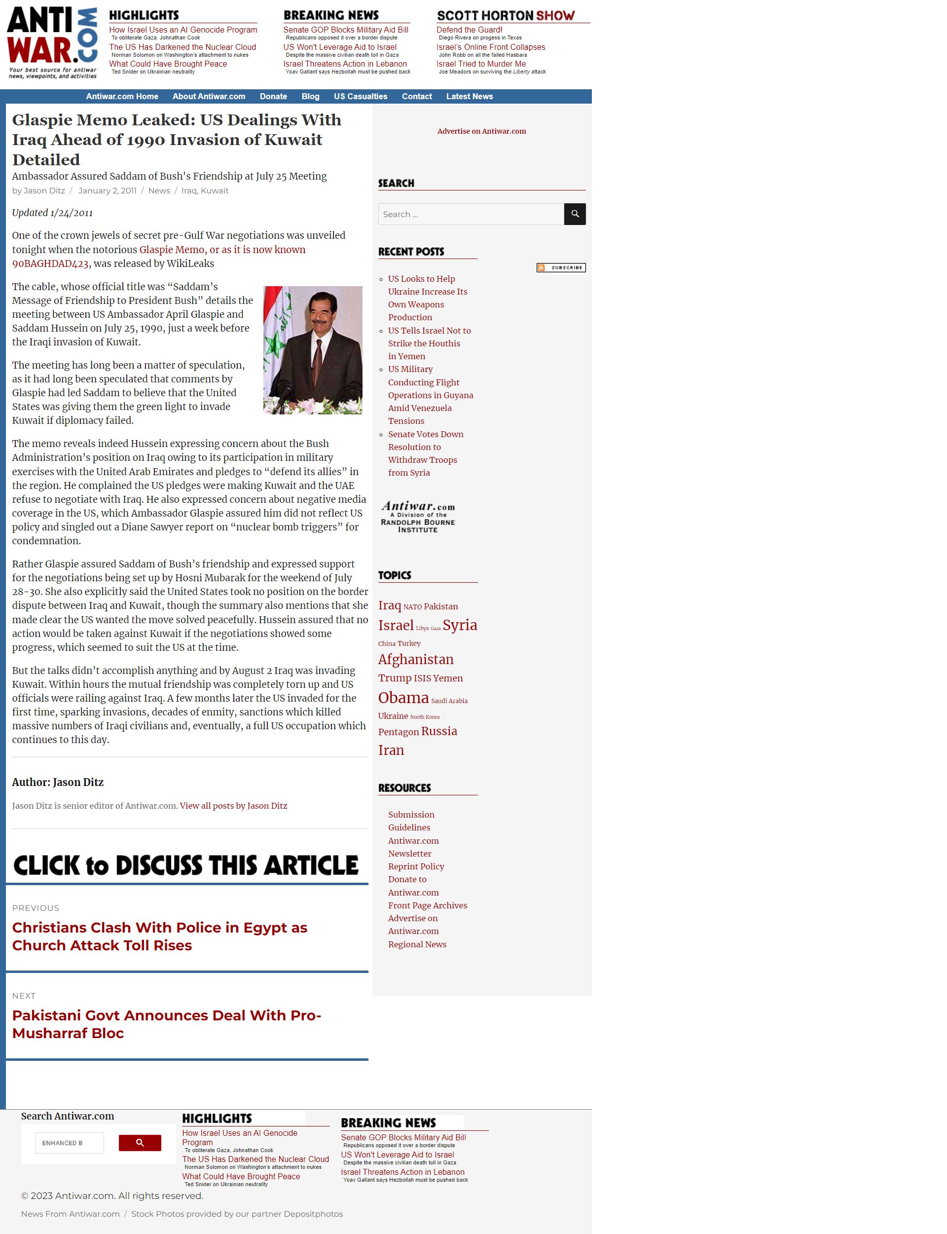 Cached Content: https://news.antiwar.com/2011/01/02/glaspie-memo-leaked-us-dealings-with-iraq-ahead-of-1990-invasion-of-kuwait-detailed/